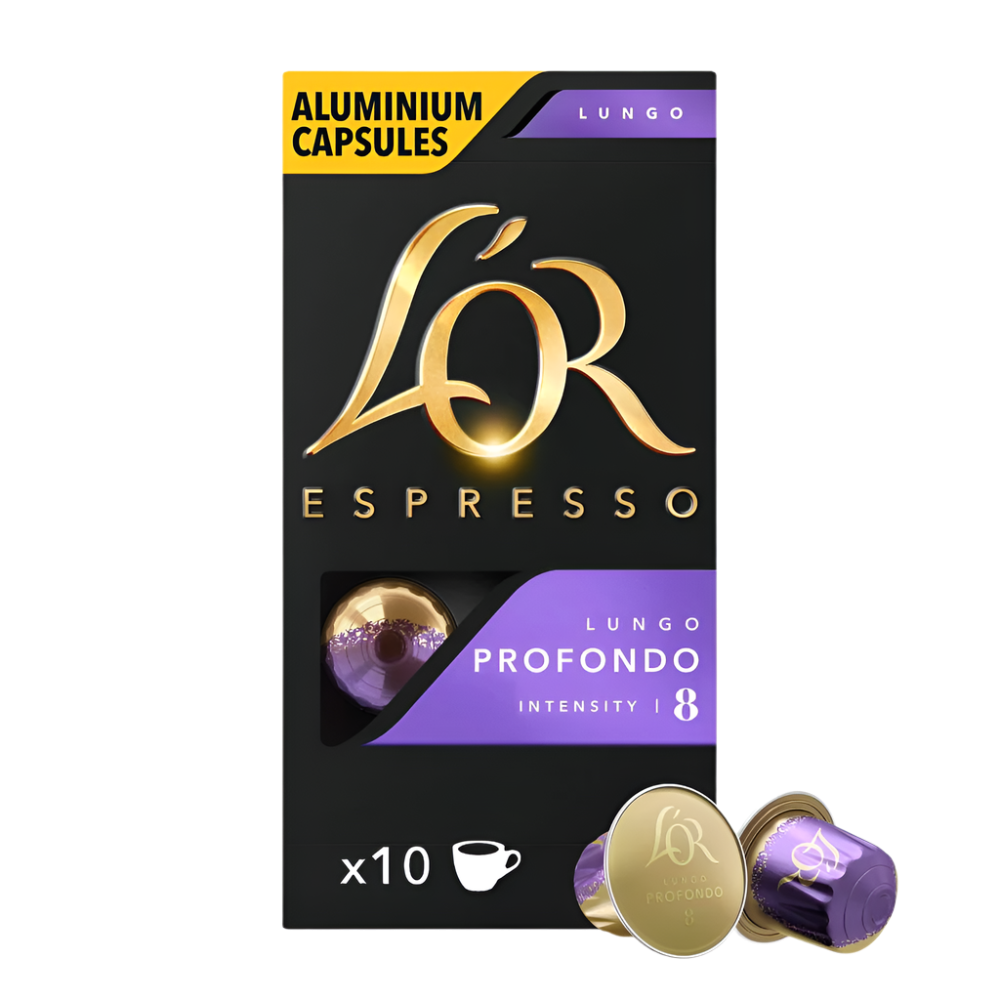 【L'OR Espresso Lungo Profondo】濃度等級8,長杯膠囊咖啡,每盒10顆。溫和順口的長杯咖啡,適合搭配早餐或午後時光。